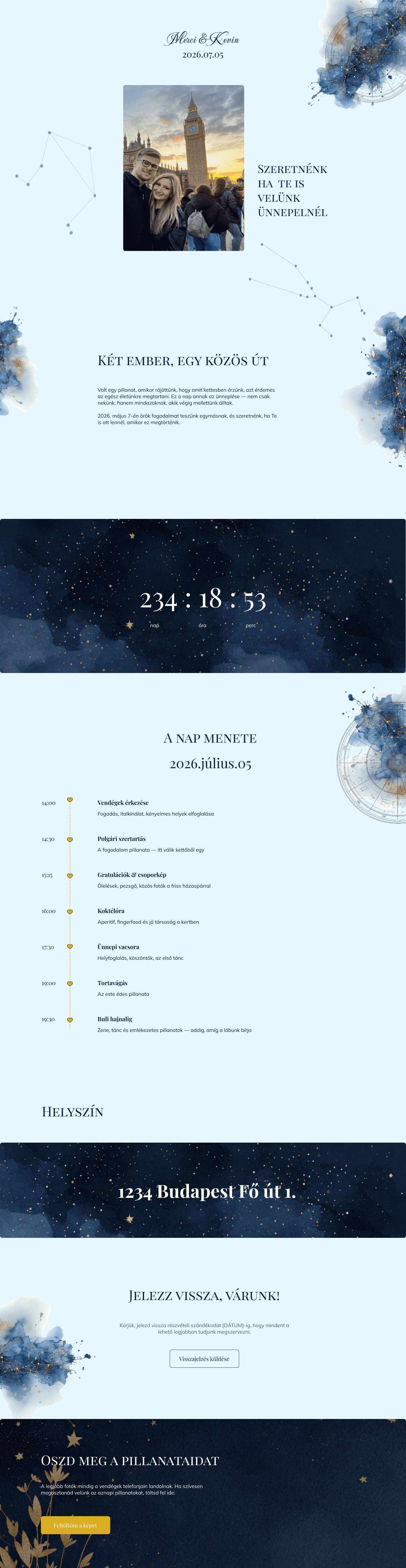 Elegáns és személyre szabott esküvői weboldal, amely segít az ifjú párnak stílusosan megosztani a nagy nap minden fontos részletét. A design a romantikus hangulatot modern megoldásokkal ötvözi, miközben a vendégek számára könnyen áttekinthető és informatív élményt nyújt.